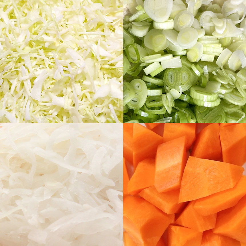 にんじん千切り、たまねぎスライス、長ねぎ輪切りなど、約50種、250アイテムの豊富なバリエーションを展開しています 。お客様のご希望のカット野菜については、お気軽にご相談ください!